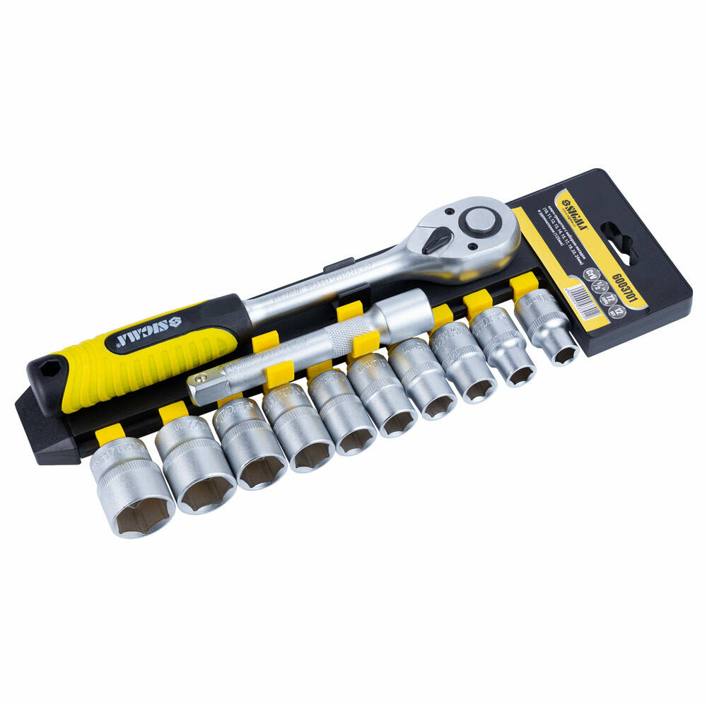 Ключ-тріскачка 1/2" з набором насадок і подовжувачем 12шт CrV mid SIGMA (6003701) призначений для роботи з різьбовими з'єднаннями при ремонті і обслуговуванні автомобілів. Всі елементи набору виготовлені з хромованадіевой стали 50BV30. Відмінною рисою даної марки сталі є велика кількість легуючих добавок, за рахунок матеріал стає менш схильним до крихкого руйнування і збільшує надійність при експлуатації. За рахунок цього торцеві голівки, здатні витримувати багаторазові змінні навантаження. Матове, хромонікелевє покриття компонентів набору збільшує термін служби інструменту і запобігає корозії.