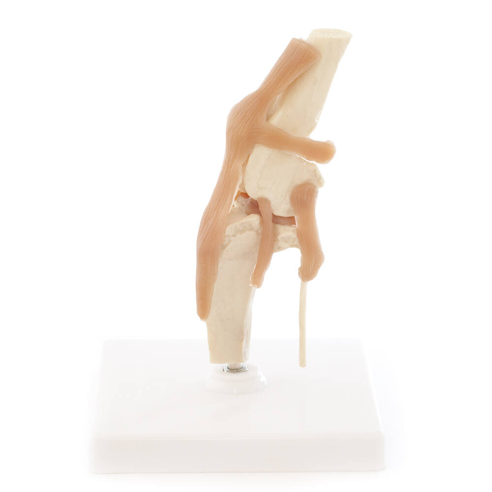 Анатомічна модель колінного суглоба собаки зі зв'язками та сухожилками представляє суглоб собаки середнього розміру. На моделі добре продемонстрований зв'язковий апарат. Конструкція кріпиться на білій пластиковій основі з використанням металевого штиря. Чудово підходить для наочного пояснення анатомічних зв'язків та обговорення концепцій терапії.