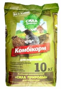 Комбікорм повнораціонний "Сила природи" для перепілок 1-4 тижні Склад кукурудза пшениця висівки пшеничні шрот соняшниковий шрот соєвий борошно м'ясо-кісткове дріжджі кормові суха сироватка підсирна крейда кормова премікс 1% (ПК-5-1) премікс 1% (ПК-6-1) премікс 1% (ПК-1-2) сіль кухонна Зберігання Сухе, захищене від прямих сонячних променів приміщення при температурі до 25 0С і відносній вологості повітря не вище 80%. Термін придатності - 6 місяців з дати виготовлення.