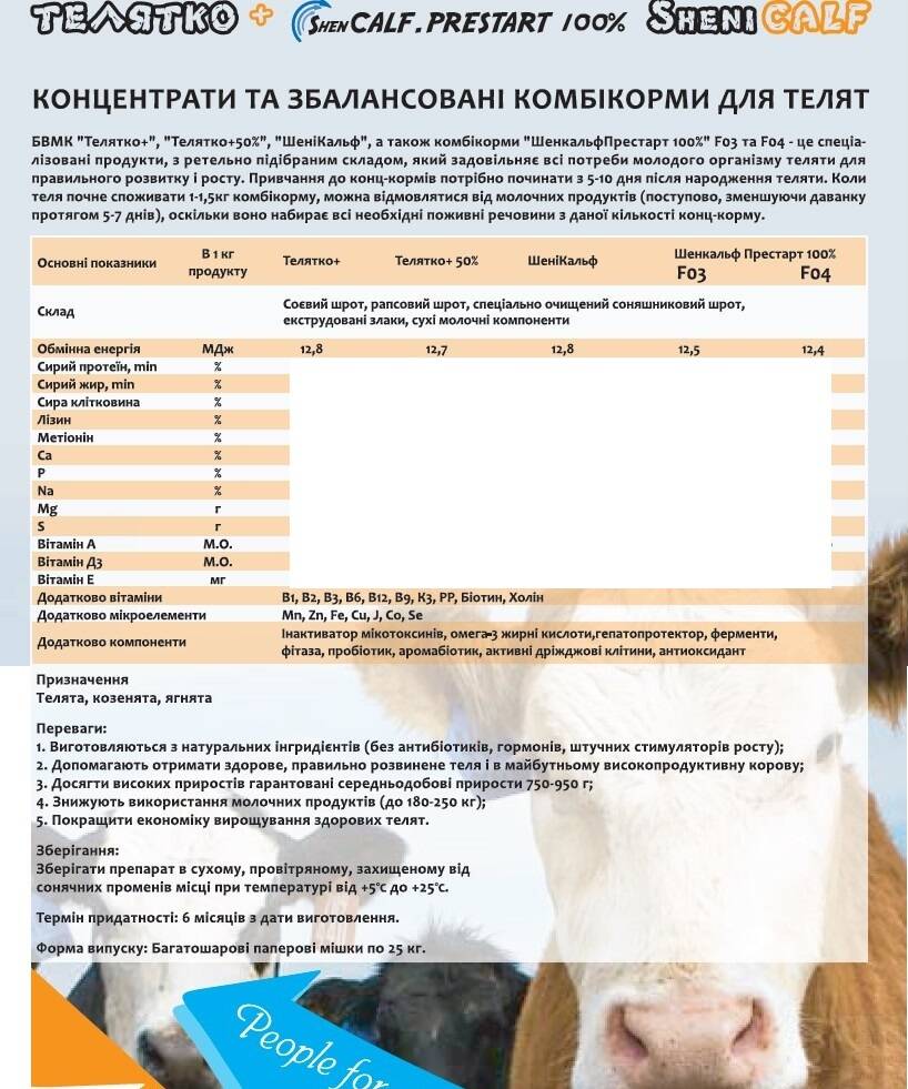 Корм престартерний для телят — перший, найбільш важливий і економічно виправданий крок до здобуття здорових корів, що ефективно використовують корми і що володіють високою молочною продуктивністю. До складу комбікорму престартерного входить ячмінь, соєвий шрот, сухе цілісне молоко, кукурудзяний глютен, амінокислоти, рослинна олія, джерела кальцію і фосфору, вітамінно-мінеральний комплекс, пробіотик, ароматизатор. Згодовування комбікорму починати з 8 денного віку в кількості 50 гр на 1 гол в добу і поступово доводити до 60 денного дня до 1200-1300 грам.