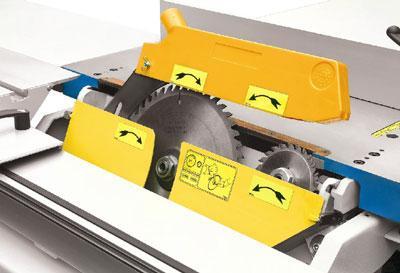 Форматный алюминиевый стол со закаленные стальные направляющие. Телескопическая линейка 1800 мм с двух поворачивающихся упоров. Линейка для параллельная резка с микрометрическая настройка. Наклонения диска до 45° со считывания по шкалу. Диаметр отверстия в столу ø260 mm с аспирационная патрубка под рабочего стола. Фрезерный шпиндель наклоняющийся сзади Предохранитель для фрезы с диаметром ø250 mm. Стол рейсмуса с ролики /CU 410/.