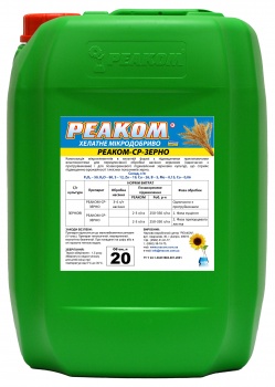 РЕАКОМ-СР-ЗЕРНО – екологічно безпечний препарат, розроблений на основі хелатних мікроелементів, які мають властивість повністю засвоюватись рослинами. Призначений для обробки насіння перед посадкою та позакореневого підживлення (у фазі кущіння та у фазі прапорового листа) зернових культур: озимої та ярої пшениці, вівса, ячменю, жита.