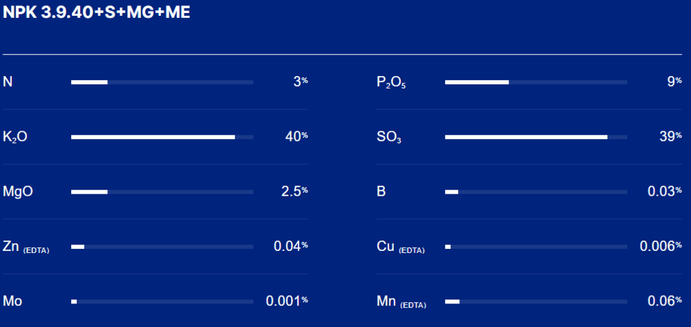 Состав: N - 3%; P - 9%; K - 40%; S - 39%; MgO - 2,5%; B - 0,03%; Fe(EDTA) - 0,04; Zn(EDTA) - 0,04%; Cu(EDTA) - 0,006%; Mo - 0,001%; Mn(EDTA) - 0,06%