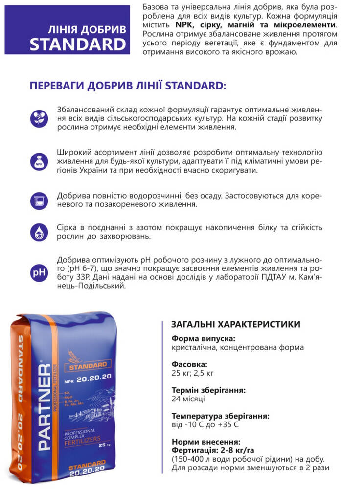 PARTNER STANDARD - это проверенное временем комплексное решение для всех видов культур, от зерновых и масличных, до овощных и плодово-ягодных. Линия предназначена прежде всего для капельного орошения, но может использоваться и во всех других системах полива. Широкий ассортимент линии позволяет разработать оптимальную технологию питания для любой культуры, адаптировать ее под климатические условия регионов и при необходимости вовремя скорректировать. Применение удобрений PARTNER STANDARD позволяет достичь максимальных результатов при умеренных затратах.