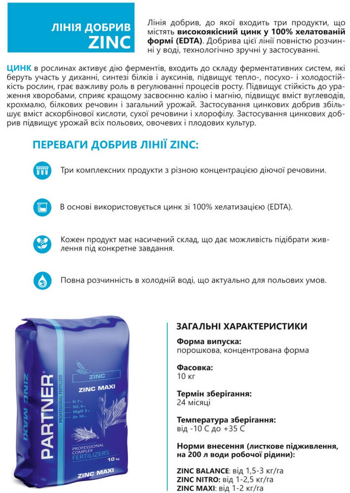 Линия удобрений ZINC - Линия удобрений, в которую входит три продукта, содержащие высококачественный цинк в 100% хелатированной форме (EDTA). Удобрения этой линии полностью растворимы в воде, технологически удобны в применении.