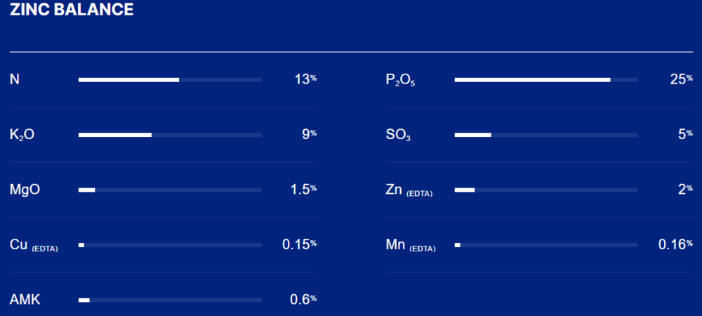 Состав: N - 13%; P - 25%; K - 9%; S - 5%; MgO - 1,5%; Fe (EDTA) - 0,16%; Zn (EDTA) - 2%; Cu (EDTA) - 0,15%; Mn - 0,16%; AMK - 0,6%.
