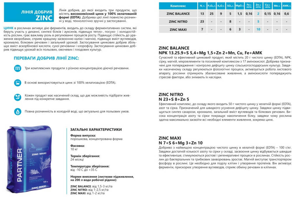 Линия удобрений ZINC - Линия удобрений, в которую входит три продукта, содержащие высококачественный цинк в 100% хелатированной форме (EDTA). Удобрения этой линии полностью растворимы в воде, технологически удобны в применении.
