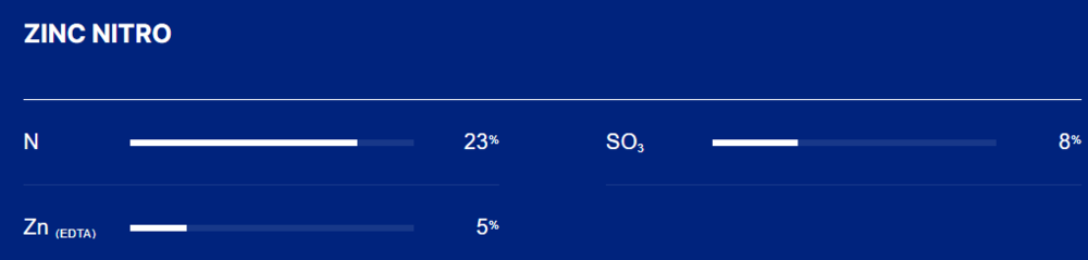 ZINC NITRO - Эффективный комплекс, в состав которого входит 50 г/кг чистого цинка в хелатной форме (EDTA), азот и сера. Предназначен для быстрого устранения дефицита цинка в сельскохозяйственных культур. Благодаря цинку повышается синтез сахарозы, крахмала, общее содержание углеводов и белковых веществ. Высокая концентрация азота и серы улучшает накопление белка, благодаря чему растение способно максимально усвоить все необходимые элементы питания, в частности цинк. Применение цинковых удобрений увеличивает содержание аскорбиновой кислоты, сухого вещества и хлорофилла. При этом отмечается снижение пораженности растений грибковыми заболеваниями. Высокая концентрация азота и серы улучшает накопления белка, благодаря чему растение способно максимально усвоить все необходимые элементы питания, в частности цинк. Удобрение полностью растворяется в воде, без осадка, предназначенное для листовых обработок.