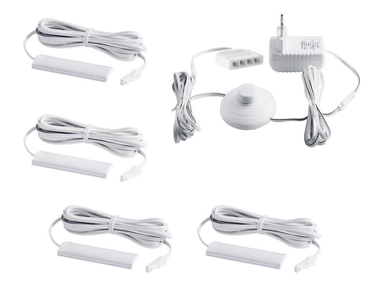 Комплект світлодіодних світильників LEDUA (4 шт.) з білим світлом і білим проводом – ідеальне рішення для підсвічування меблевих полиць, кухонних гарнітурів, вітрин або декоративних елементів інтер’єру. Завдяки ножному вимикачу керування освітленням стає зручним та інтуїтивно простим, що особливо актуально для зон, де руки можуть бути зайняті.