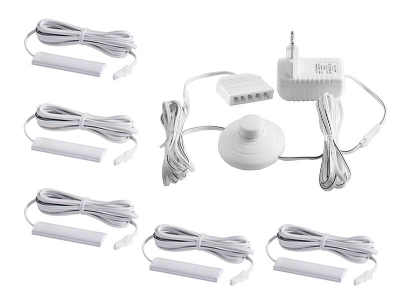 Комплект світильників світлодіодних з ножним вимикачем накладних для підсвітки меблевих полиць 5шт 220V синє світло білий провід LEDUA
