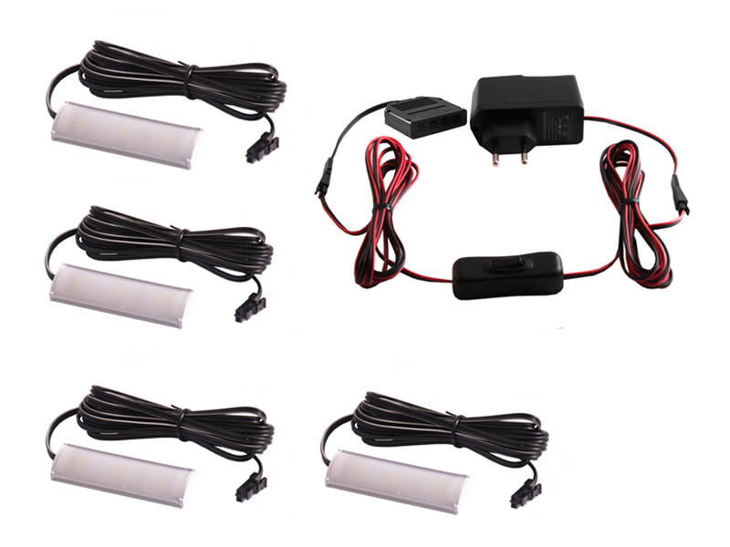 Комплект світильників світлодіодних з ручним вимикачем накладних для підсвітки меблевих полиць 4шт 220V біле світло чорний провід LEDUA