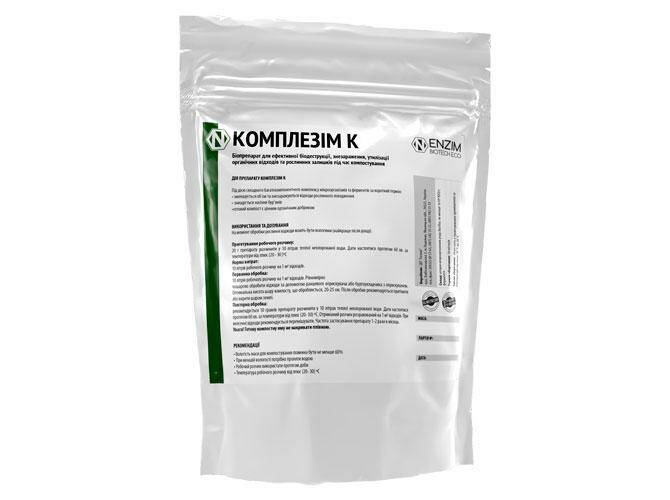 Біодеструктор Комплезім К - біопрепарат для компостування - ефективної біодеструкції та утилізації органічних відходів та рослинних решток у компостих ямах, буртах, сховищах тощо.