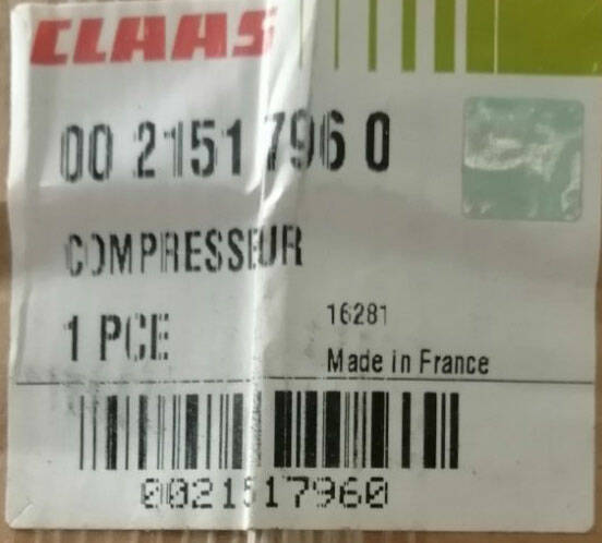 Компреcсор CLAAS (КЛААС) 21517960 !!! 100% оригинал !!!, самые низкие цены в Украине, в наличии на складе. agroukrdetal.com.ua предлагает широкий ассортимент оригинальных запчасти и расходных материалов к сельхозтехнике, посевной и почвообрабатывающей технике, комбайнам и косилкам, от ведущих заводов-производителей: Claas, Holmer, Amazone, Khun, КамАЗ, МАЗ, ГАЗ, ЗИЛ, СМД Отгрузка со склада Киевская область, в г. Вышгород Доставка Новой Почтой Для получения всего каталога оригинальных запчастей к технике CLAAS (КЛААС), обращайтесь пожалуйста к нашим менеджерам по телефонам, почте, через обратную связь. Хорошего вам дня.