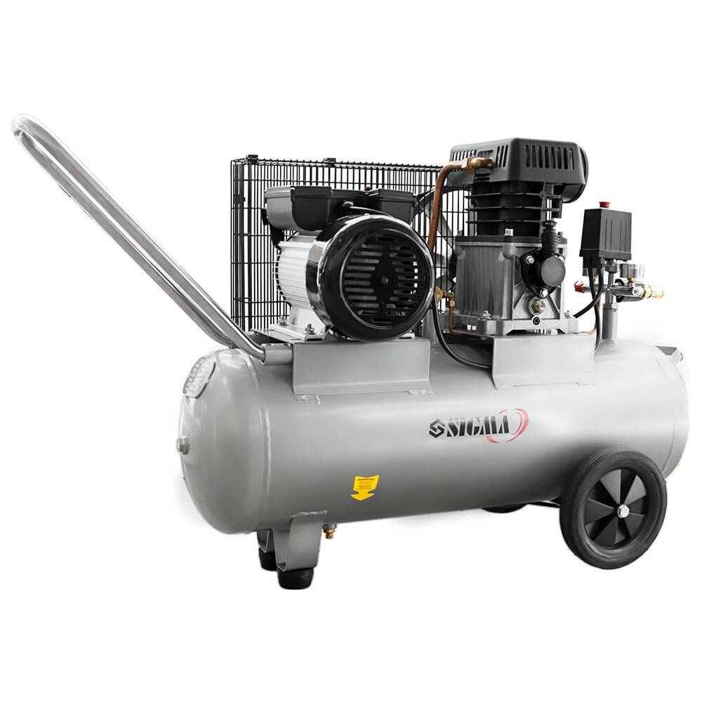 Компресор двоциліндровий пасовий (II) 2.5кВт 335 л/хв 10бар 50л (2 крана) SIGMA (7044121) призначений для нагнітання стисненого повітря з подальшою його подачею під тиском в різні типи пневмоінструменту і пневмообладнання. Ремінний привід компресора закритий металевим кожухом, який запобігає від попадання сторонніх предметів. Опорна ніжка забезпечує стійке положення на поверхні, а гумова подушечка знижує рівень вібрації.