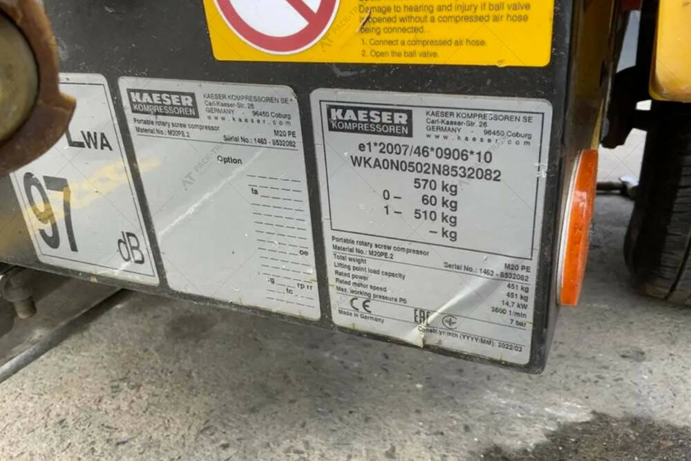 Компресор б/в Kaeser M20PE, 2022 р/в, з напрацюванням 348 м/год. Двигун – Kubota Stage V. Габаритна Ширина-1,2 м. Висота-1,2 м. Довжина-3,0 м. Шини: 145/80 R 13. Тиск 7 BAR.