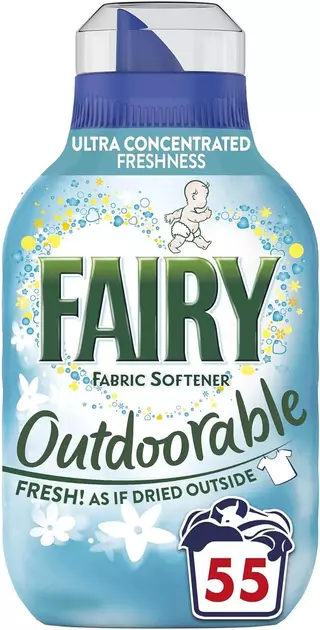 Ультраконцентрована формула свіжості Fairy Outdoorable забезпечує 55 прань у невеликій пляшечці. Fairy Outdoorable був розроблений разом зі споживачами, щоб відтворити свіжість на відкритому повітрі, і він продовжує випромінювати свіжість, коли тканини щойно висушені, зберігаються в шафі та навіть коли ви переїжджаєте.