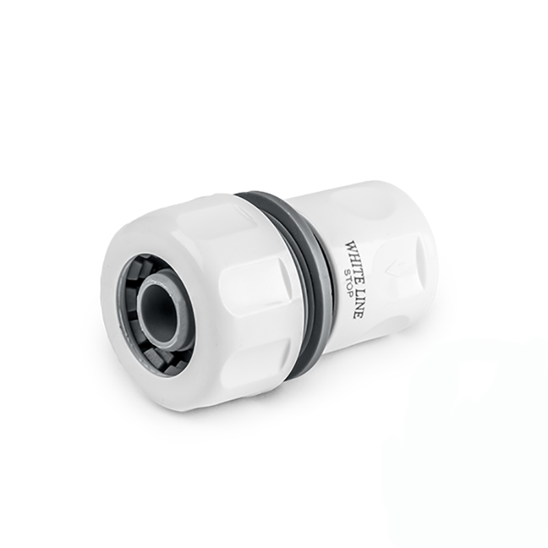 Конектор 3/4 STOP WL-2150, серії WHITE LINE, виготовлений з високоякісного пластику. Призначений для з'єднання шланга діаметром 3/4" з різними елементами поливальної системи, що мають стандартний ніпель; дозволяє швидко і легко змінювати пристрої для поливу.