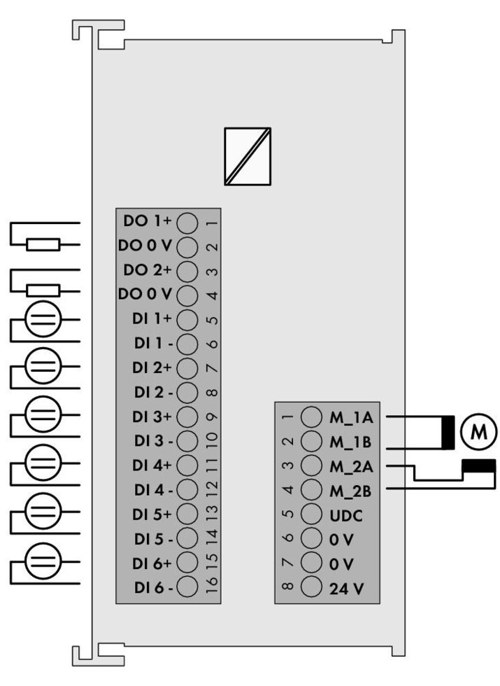 | Устройство | Входы (предустановки): ДВх 1: останов привода, ДВх 2: контрольный вход, ДВх 3: толчковый переключатель в положительном направлении, ДВх 4: толчковый переключатель в отрицательном направлении, ДВх 5: концевой выключатель в положительном направлении, ДВх 6: концевой выключатель в отрицательном направлении; выходы (предустановки): ДВых 1: цель достигнута, ДВых 2: ошибка. Входы и выходы могут быть произвольно переконфигурированы. |