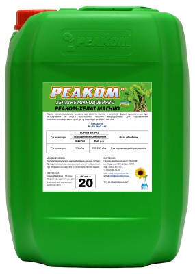 РЕАКОМ–ПЛЮС–ХЕЛАТ МАГНІЮ являє собою рідкий концентрований розчин, що містить магній у хелатній формі, призначений для застосування як екологічно чисте мікродобрива для підживлення сільськогосподарських культур чутливих до дефіциту магнію.