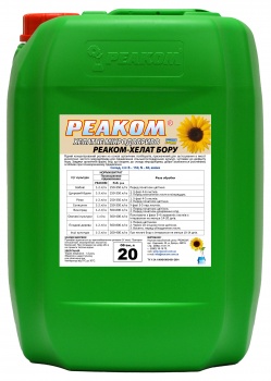 РЕАКОМ-ХЕЛАТ БОРУ – концентрований розчин на основі органічно-асоційованих полиборатов, призначений для застосування в якості екологічно чистого мікродобрива для підживлення сільськогосподарських культур, чутливих до дефіциту бору (ріпак, цукровий буряк, соняшник, виноград та ін).