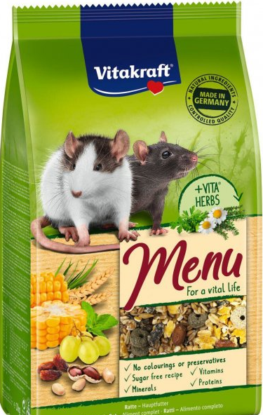 Vitakraft Menu - це збалансований раціон із цінним зерном, смачними фруктами та хрусткими горіхами для здорового всебічного харчування щурів. Корм збагачений формулою Vita Herbs - ретельно відібраною композицією цінних трав, таких як чебрець і м'ята, а також квітів гібіскусу та ромашки, які підтримують здоров'я. Білки забезпечують важливі амінокислоти та є оптимальним джерелом енергії для активних щурів. Спеціальна комбінація з натуральних інгредієнтів пов'язує неприємні запахи та зменшує їхнє утворення.
