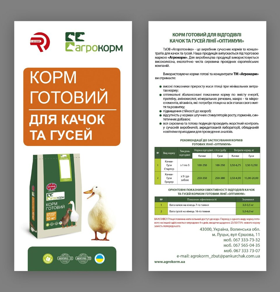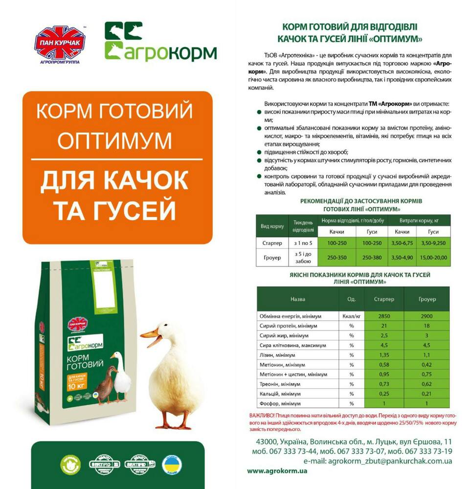 Правильно збалансовані корми для качок та гусей дозволять скоротити період від- годівлі та допоможуть власникам поголів’я отримати значну економічну вигоду. Врахо- вуючи особливість даного виду спеціалісти ТзОВ «Агротехніка» розробили універсаль- ні корми для відгодівлі качок та гусей.