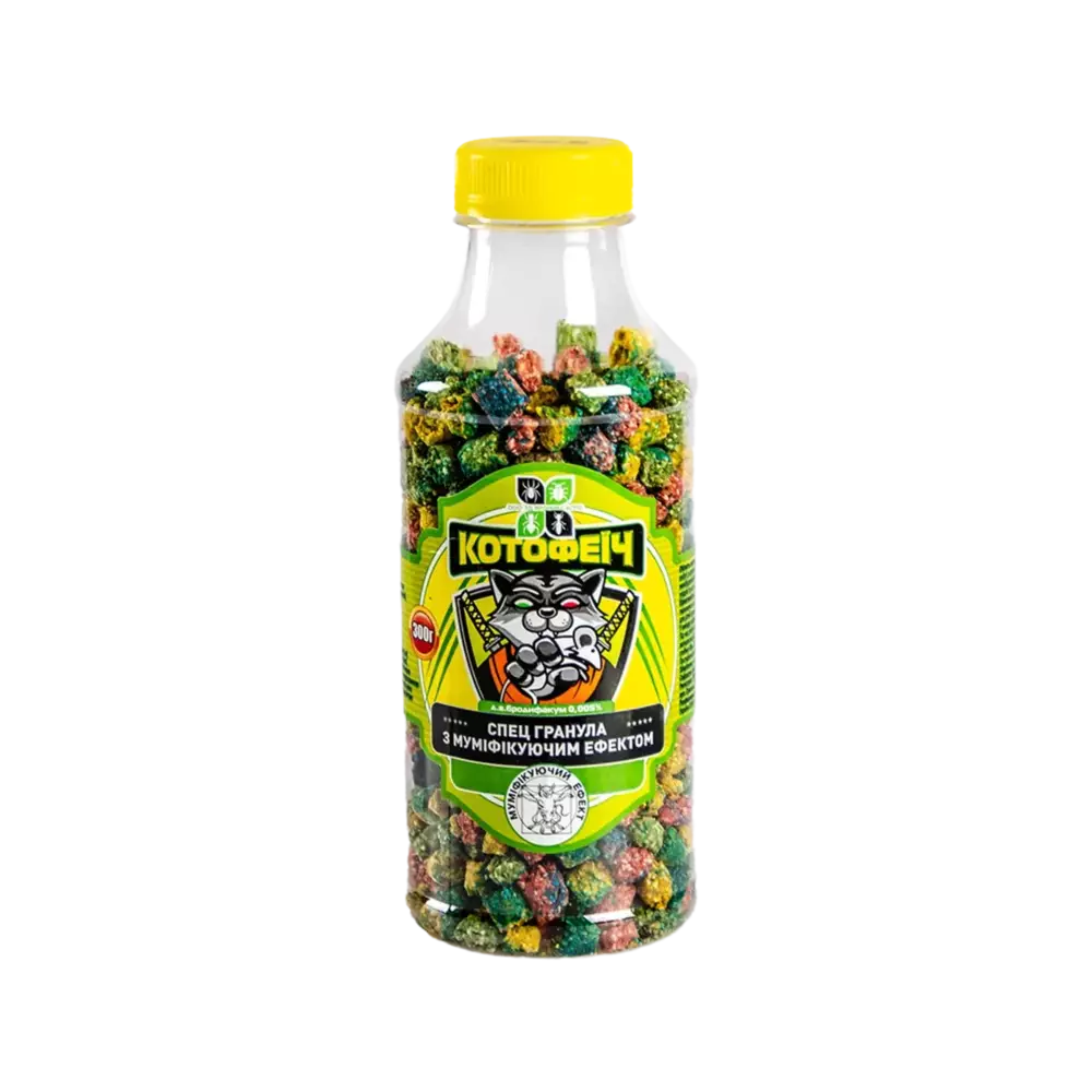 Отрути, що входять до складу, від гризунів Котофеїч муміфікуючі речовини, що входять до складу отрути від гризунів Котофеїч, не дозволяють трупам шкідників розкладатися. Це дозволяє уникнути неприємного запаху. Коли отрута від гризунів починає залишатися недоторканою, можна припинити розкладання.