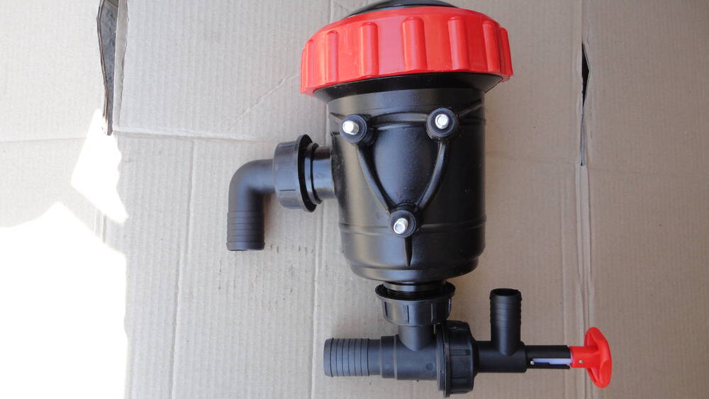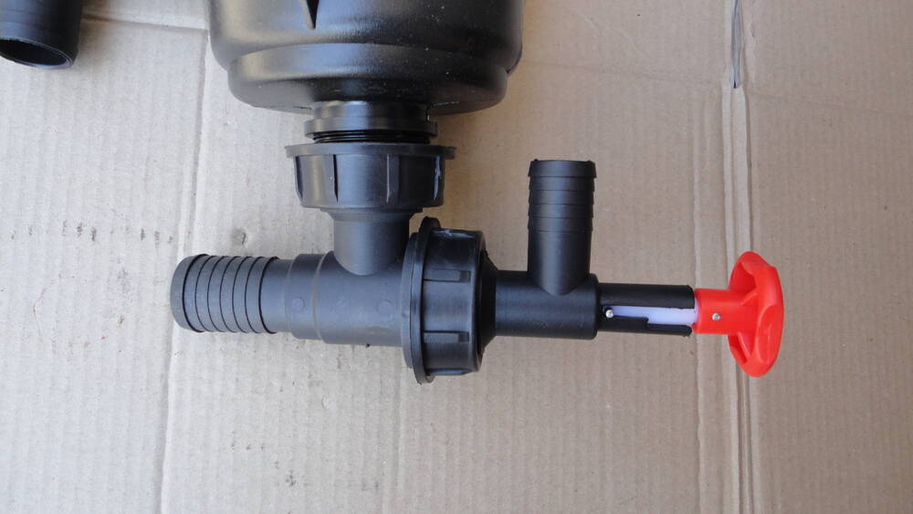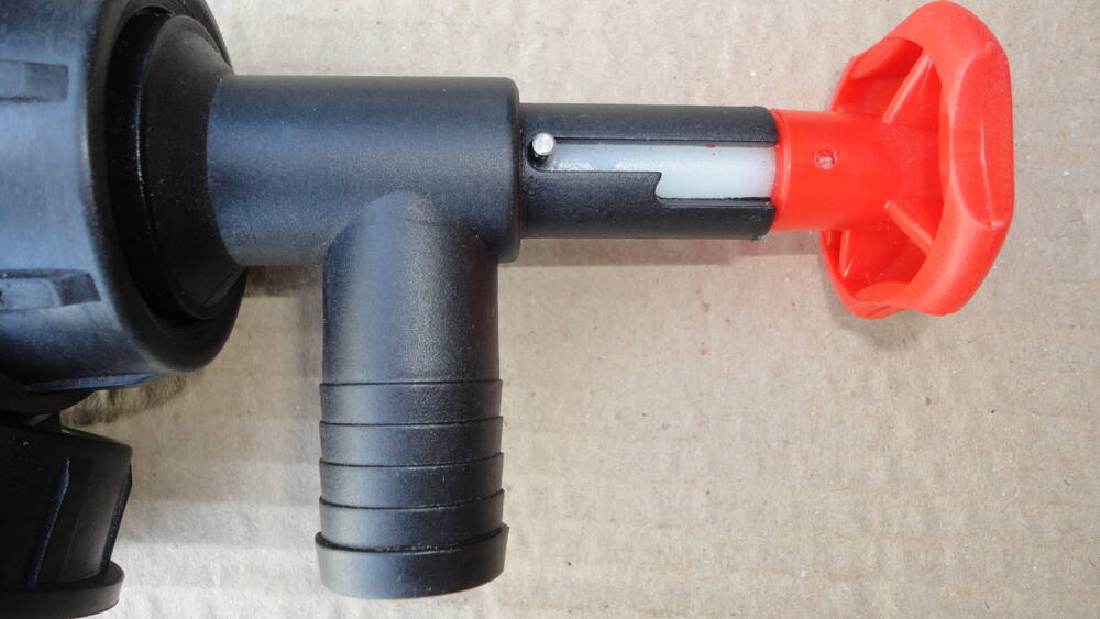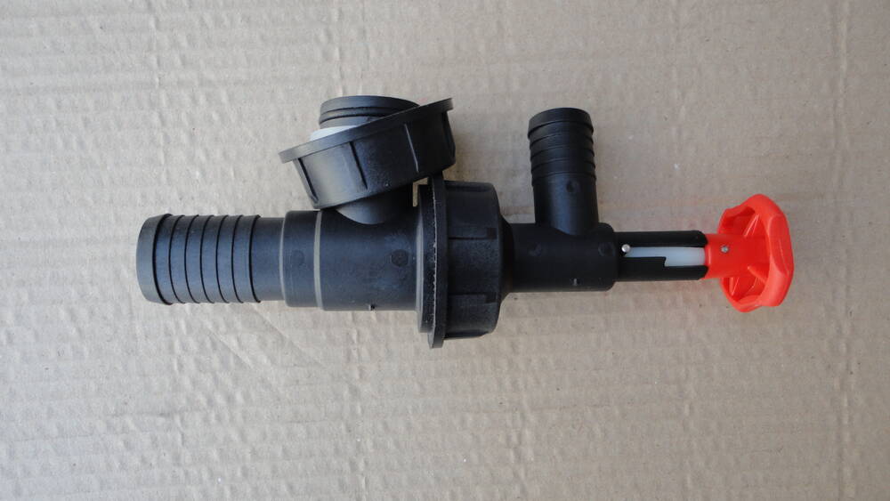 Цей кран має також три положення. 1. перше — пропускає суміш 2.Друге спускання — для зливання залишків рідини та Третє положення Закачування — для закачування води до бака обприскувача через фільтр із будь-якої ємності та водойми