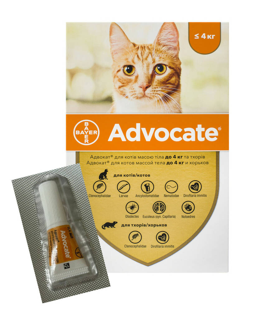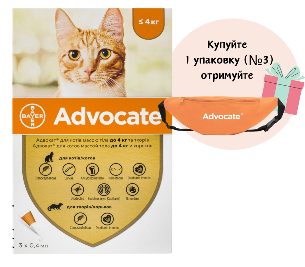 Краплі Адвокат для кішок до 4 кг (0,4 мл) упаковка 3 шт, BAYER