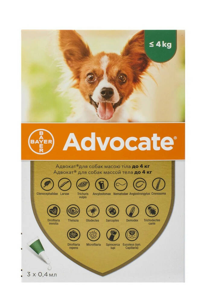 Краплі Адвокат для собак вагою до 4 кг (0,4 мл) упаковка 3 шт, BAYER