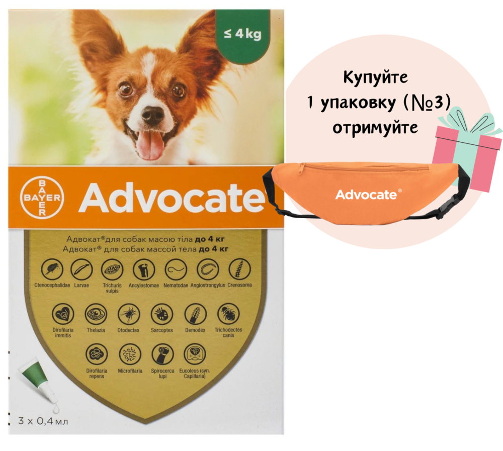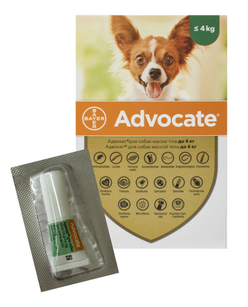 Краплі Адвокат собак до 4 кг BAYER - золотий стандарт контролю паразитів у собак (ціна за упаковку).
