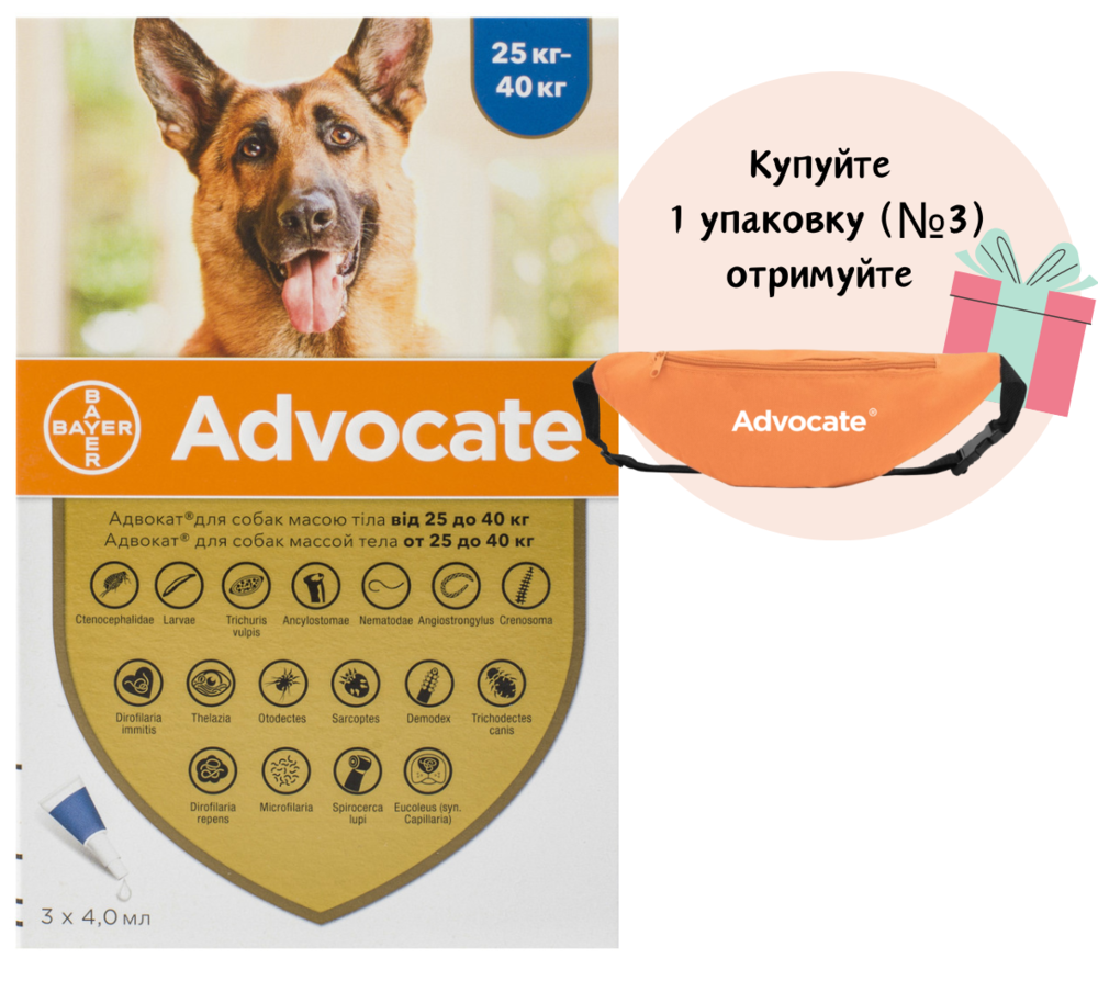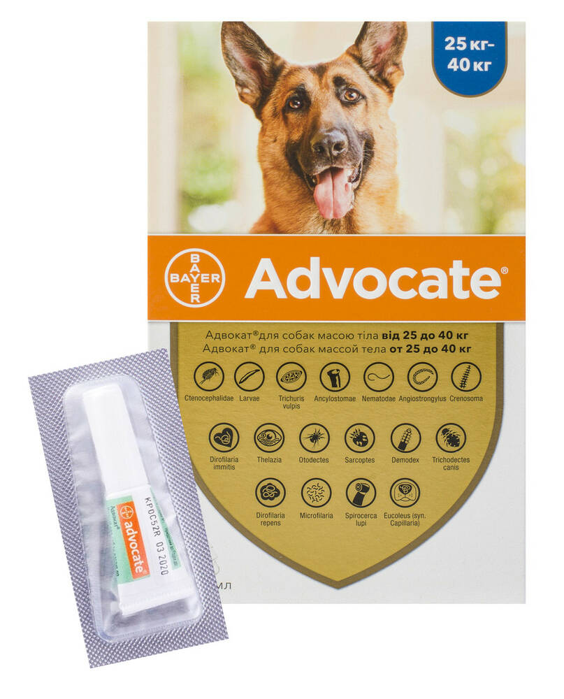 Краплі Адвокат собак від 25 до 40 кг BAYER - золотий стандарт контролю паразитів у собак (ціна за упаковку).