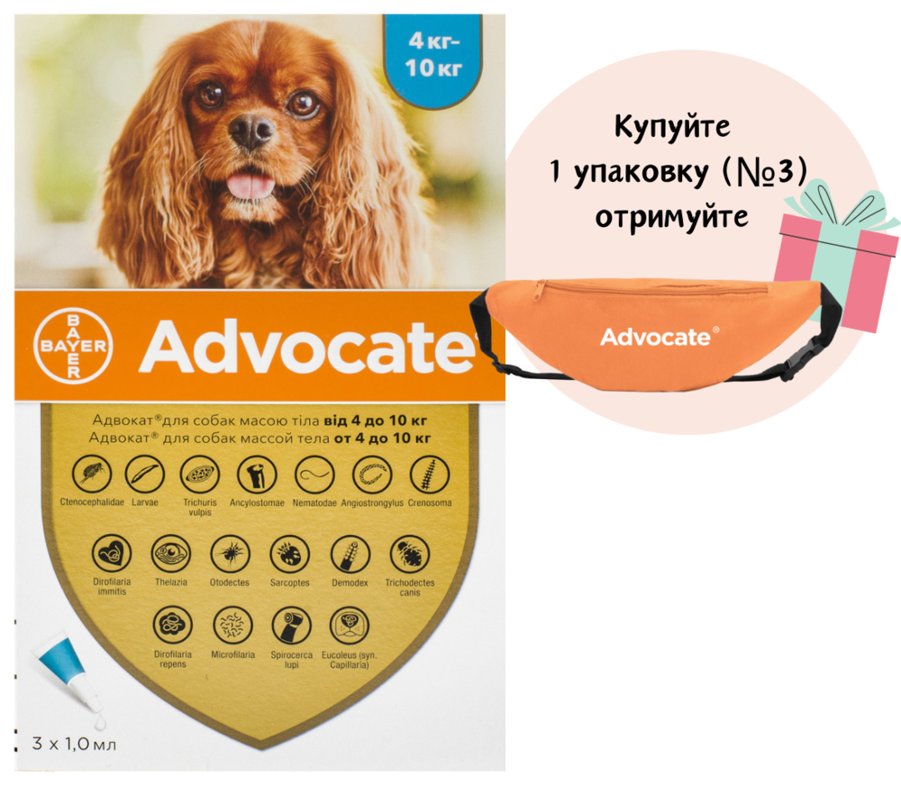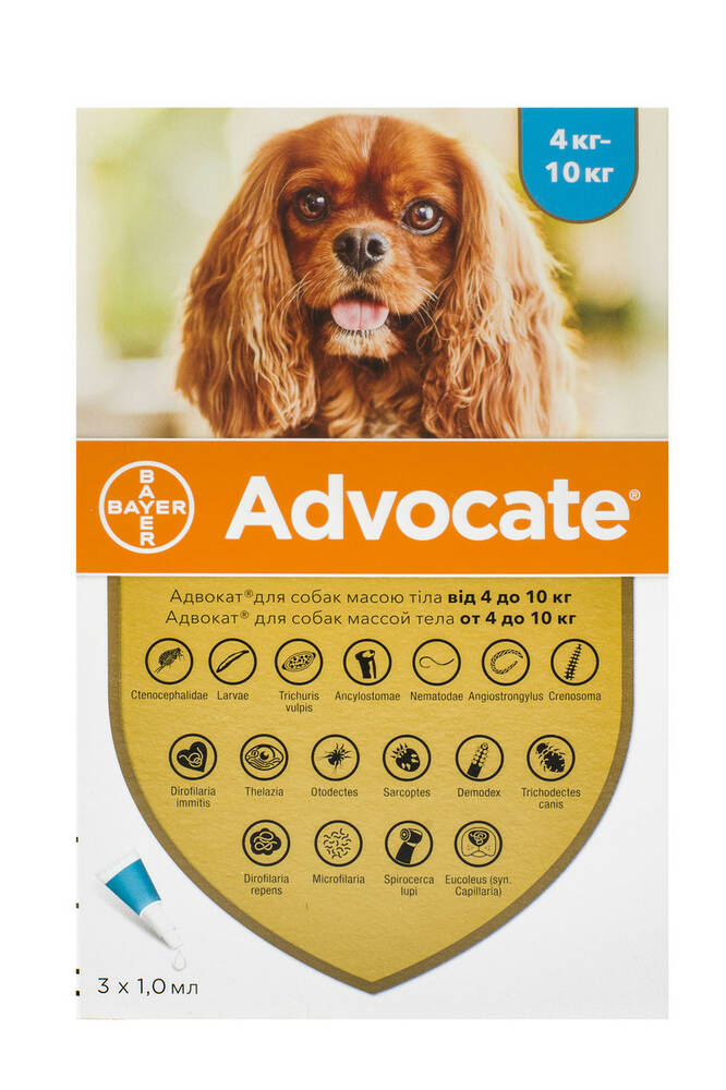 Краплі Адвокат для собак вагою від 4 до 10 кг (1 мл) упаковка 3 шт, BAYER