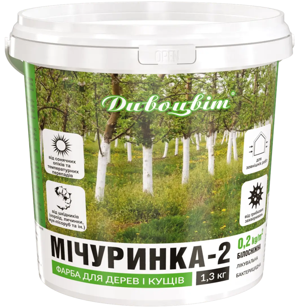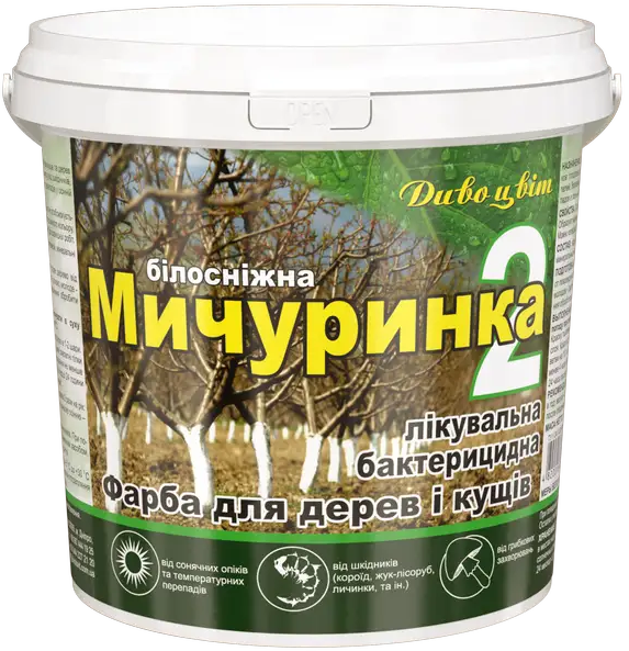 Краска для садовых деревьев и кустов Мичуринка-2 - Предназначена для окраски стволов деревьев и кустов (плодовых, декоративных) с целью защиты от вредителей, болезней, солнечных ожогов, температурных перепадов в осенний и весенний периоды.