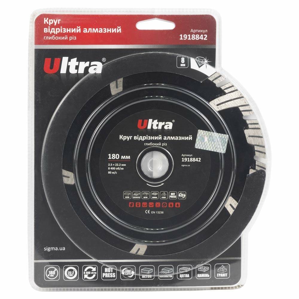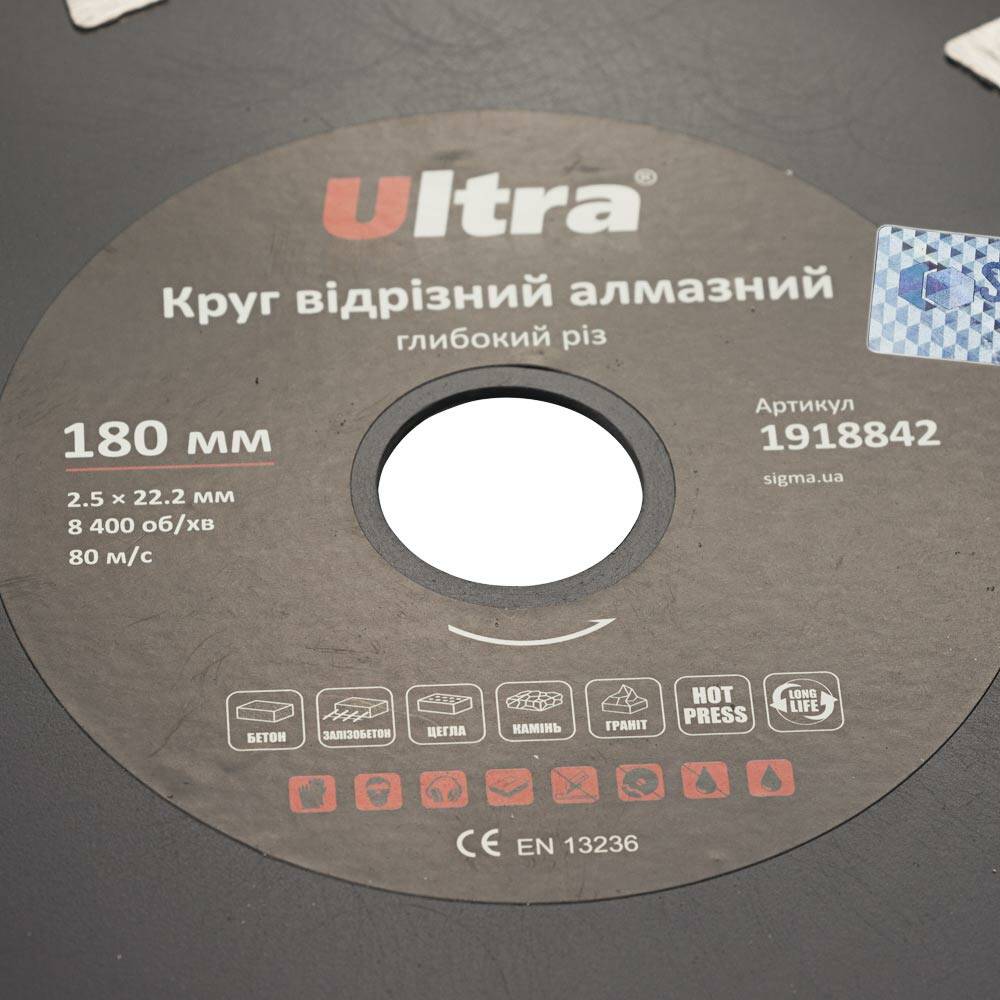 Круг відрізний алмазний Глибокий різ Ø180×22.2мм ULTRA (1918842) призначений для різання бетону, залізобетону, тротуарної плитки, граніту, шиферу, черепиці, цегли, каменю та інших будівельних матеріалів без примусового охолодження. Корпус виготовлений із міцної сталі, здатної витримати значні механічні навантаження та високу температуру. Добре збалансована основа зменшує вібрацію на інструмент та забезпечує високу надійність під час експлуатації.