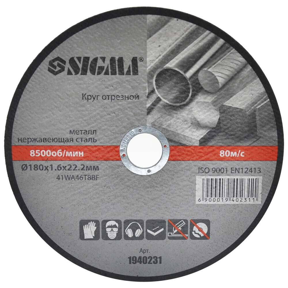 Круг відрізний по металу та нержавіючої сталі Ø180×1.6×22.2мм, 8500об/хв SIGMA (1940231) призначений для різання виробів з металів і нержавіючої сталі, роботи з кузовной сталлю і іншими аналогічними матеріалами. Робочим інструментом при роботі відрізного круга є кутова шліфувальна машина (КШМ, "болгарка").