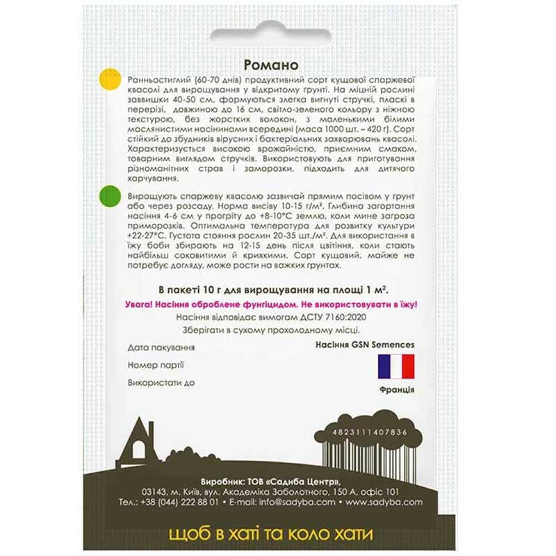 Квасоля Романо належить до ранньостиглих сортів. Її період дозрівання становить приблизно 60-70 днів, що дозволяє отримувати ранню продукцію. Кущі заввишки 40-50 см формують ніжні, злегка вигнуті стручки довжиною до 16 см світло-зеленого кольору. Стручки не містять жорстких волокон, тому вони ідеально підійдуть для кулінарії. Усередині розташовані дрібні білі маслянисті насінини. Маса 1000 насінин становить приблизно 420 грамів.
