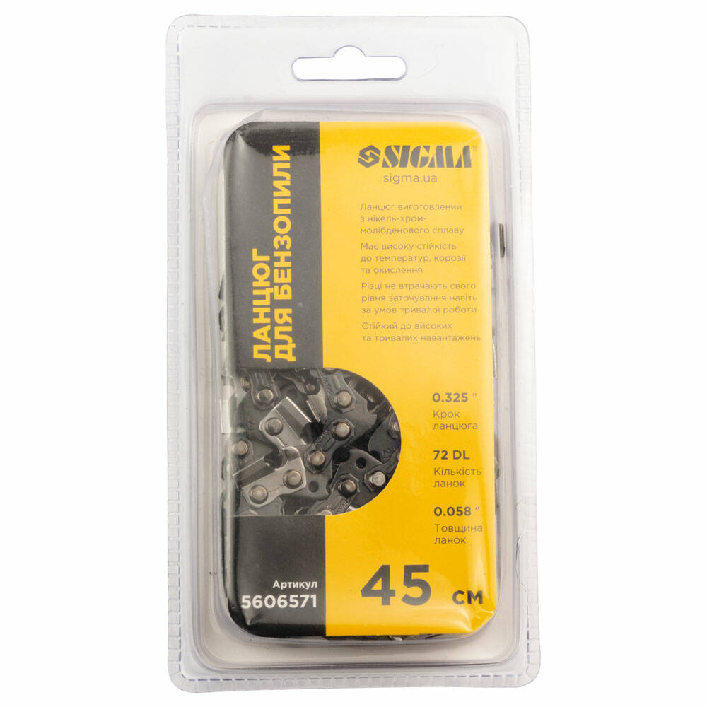 Ланцюг для бензопили 45см крок ланцюга 0.325 паз 1.5мм 72DL напівчизель SIGMA (5606571) призначений для різання деревини та інших матеріалів. Він складається із зубів, які обертаються навколо напрямної шини, створюючи силу, яка ріже матеріал.