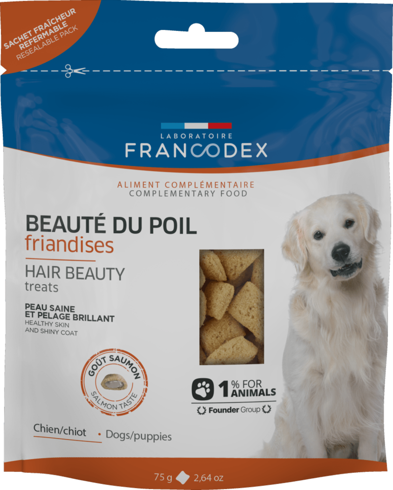 FRANCODEX TREATS FOR A BEAUTIFUL ШЕРСТЬ містить збалансовану суміш незамінних жирних кислот і вітамінів, які допомагають покращити сухість, подразнення або чутливу шкіру. Не містить штучних консервантів і барвників, ласощі містять біотин і цинк з антиоксидантними властивостями, які допомагають зберегти шкіру і шерсть здоровими.