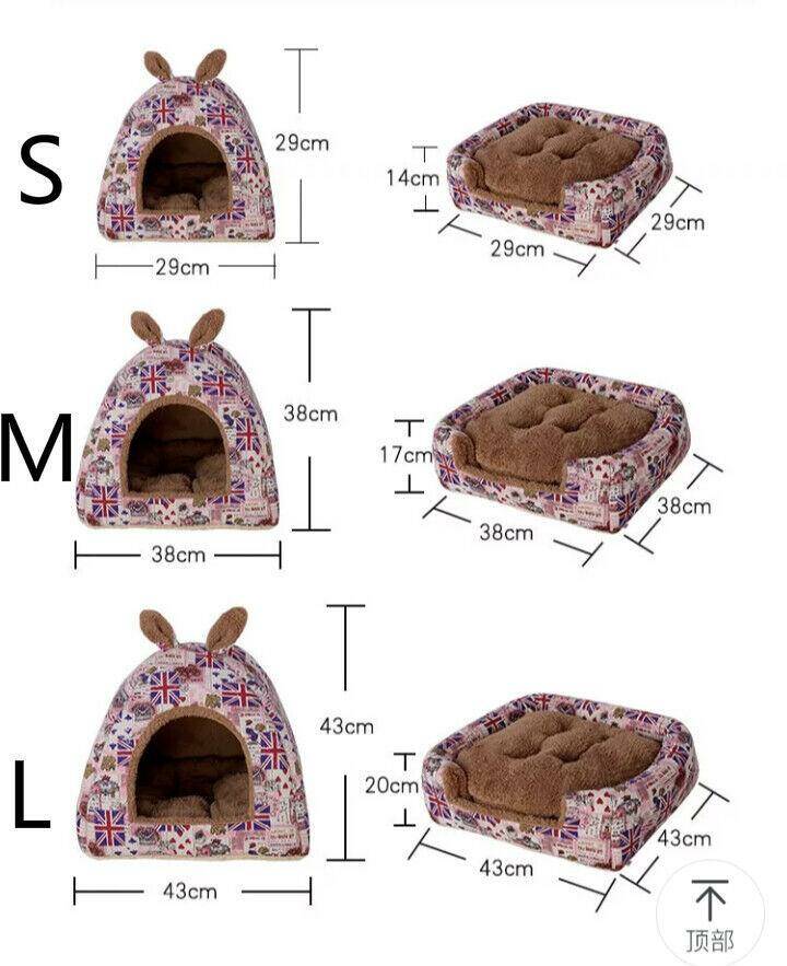 Затишний, стильний та яскравий лежак-будиночок/будка для котів та собак дрібних порід, форма з вушками та малюнками. Виготовлений з м'якого, плюшевого тканинного матеріалу - фліс та олефін, + нейлон. Матеріали виробу добре зберігають тепло, добре миються (можна чистити в пральній машині).