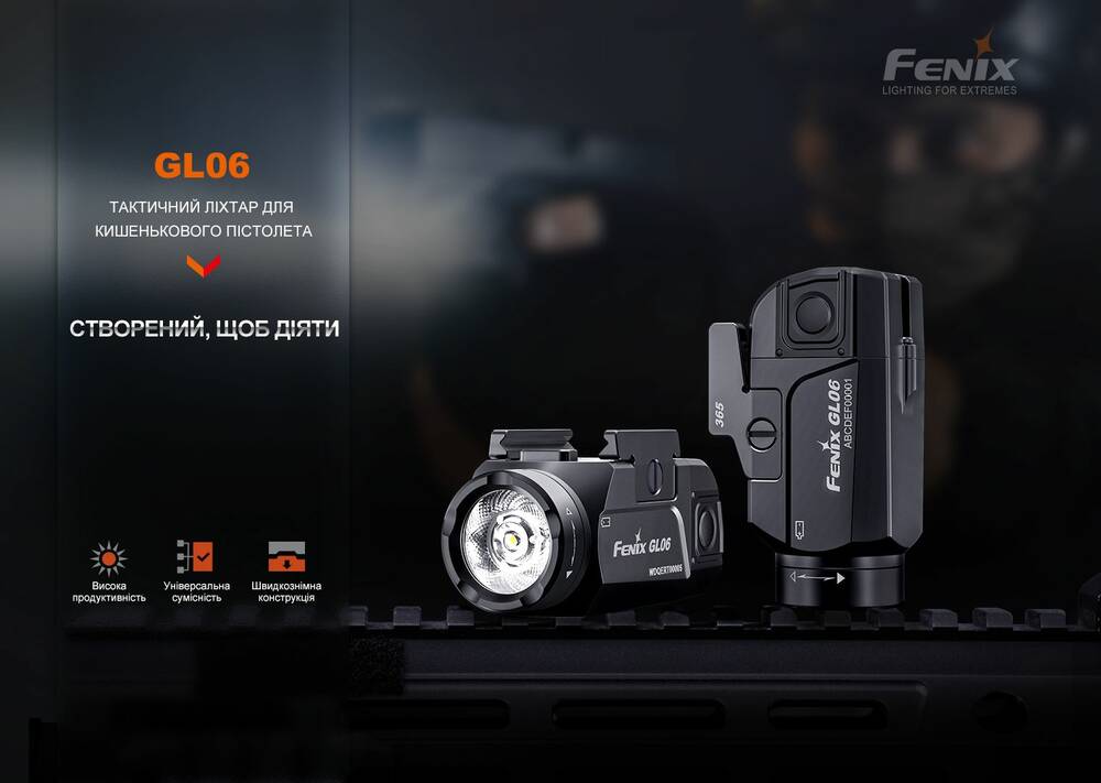 Ліхтар Fenix GL06 — це спеціалізований освітлювальний пристрій для представників поліції та охоронців, які застосовують у своїй діяльності зброю. Конструкція ліхтаря передбачає фіксацію на пістолет із планкою Пікатінні або Glock. Кріплення здійснюється одним рухом руки: для цього потрібно пересунути бічну панель до упору вниз у напрямку символу із закритим замком. Для кожної планки до комплекту входять окремі ключі.
