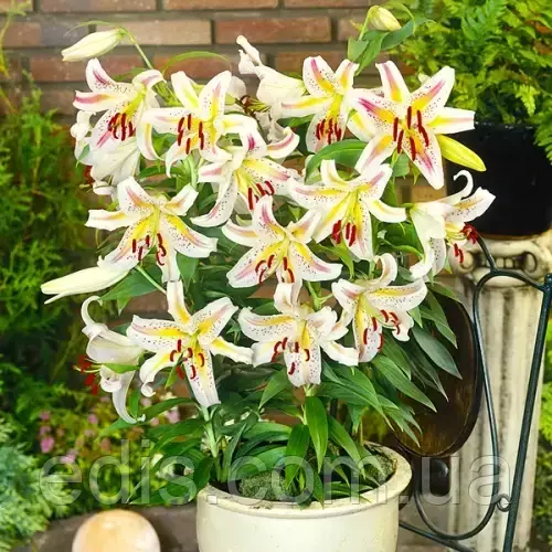 опис квітки: квіти зірчастої форми, з кремовими пелюстками та яскравим жовто-червоним "сплеском" біля основи, що надає особливої ​​виразності, тичинки насиченого помаранчевого відтінку додають контрасту та глибини композиції;