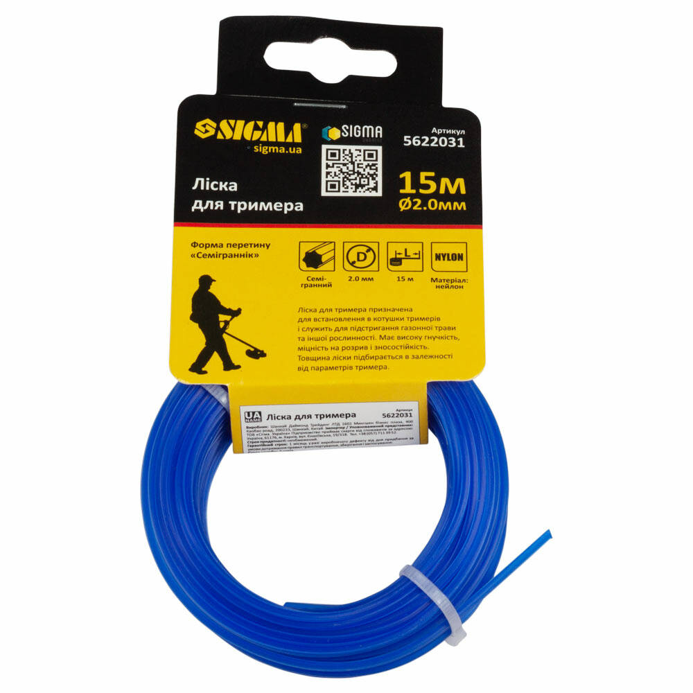 Ліска для тримера "семигранник" Ø2.0мм 15м SIGMA (5622031) призначена для встановлення в котушки тримерів і служить для підстригання газонної трави та іншої рослинності. Виготовлена з високоякісного нейлону. По всій довжині має однакову товщину. Має високу гнучкість, міцність на розрив і зносостійкість. Не розшаровується і не втрачає своїх якостей. Товщина ліски підбирається в залежності від параметрів тримера.