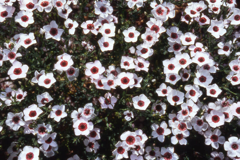 Льон великоквітковий, білий з червоним вічком – це однорічна трав'яниста рослина висотою до 45 см з витонченими прямостоячими гіллястими стеблами. Квітки дуже ніжні, зібрані на верхівці в пухке суцвіття-щиток, до 3 см в діаметрі. Насіння сіють ранньою весною, розкидаючи його по всій площі. Потім посіви боронують, при цьому закладаючи насіння в грунт на глибину до 1,5 - 2 см. Цвітіння рясне, з квітня по травень. Це невибаглива рослина, стійка до посухи, переносить незначні заморозки. Краще росте на сонячних ділянках з легкими грунтами. Використовується для оформлення клумб, міксбордерів і альпійських гірок; найбільш ефектно виглядає в групових посадках.