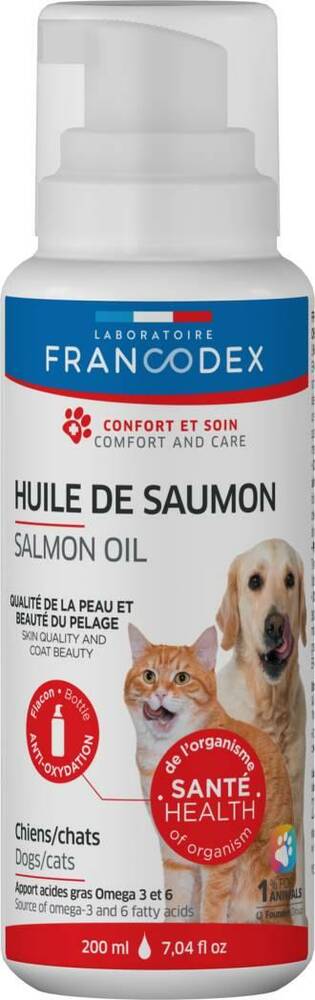 Francodex Salmon Oil містить незамінні жирні кислоти (омега-3 і омега-6). Незамінний жир необхідний для багатьох функцій організму, а його дефіцит може спричинити, серед іншого, тьмяну шерсть, лупу та випадання волосся. Деякі особливі ситуації також вимагають більшої кількості незамінних жирних кислот у раціоні, наприклад, під час інтенсивних або тривалих фізичних вправ, вагітності, лактації та росту. Додавання олії лосося до щоденного раціону може обмежити ризик дефіциту, задовольнити конкретну потребу та підвищити загальний смак їжі для собак і котів, які вибагливі в їжі.