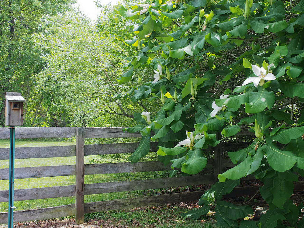 Квіти з трьома фіолетовими плямами на внутрішніх пелюстках з'являються переважно у верхньому ярусі крони в центрі мутовки з великих листів. Квіти вражаюче великі - до 30 см в діаметрі, з запашним ароматом, спочатку молочно-вершково-білі, пізніше, відцвітаючи - набувають відтінку слонової кістки.