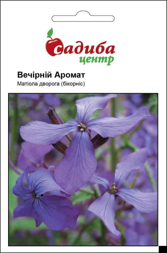 Матіола Вечірній Аромат - однорічна рослина з гіллястим стеблом висотою до 50 см. Квіти невеликі, бузкового кольору, з приємним ароматом, відкриваються ввечері. Характеризується прискореним циклом розвитку (від посіву до цвітіння 60 днів). Насіння змішують з піском і висівають прямо в грунт у квітні – травні на відстані 15-20 см. Цвіте з червня по липень. Якщо насіння сіяти 2 - 3 рази, витримуючи між посівами двотижневу перерву, то це продовжить період цвітіння з червня до жовтня. Матіола досить холодостійка, невибаглива рослина, краще росте на сонячних місцях, але витримує і напівтінь. Використовують матіолу для балконного озеленення, для змішаних посадок, мавританських газонів і клумб.