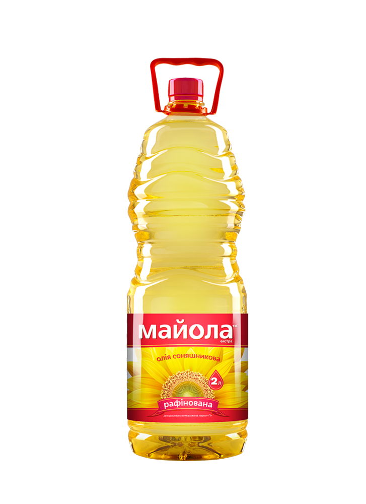 Олія соняшникова рафінована дезодорована виморожена марки П Склад: 100% соняшникова олія Об'єм: 2 літра Маса нетто: 1840 г Термін придатності: 24 місяці. Енергетична цінність 100 г продукту: 899 кКал Природній вміст вітаміну Е Виготовляється згідно ДСТУ4492:2005 ISO 22000 Пакується в картонні короби по 8 пляшок
