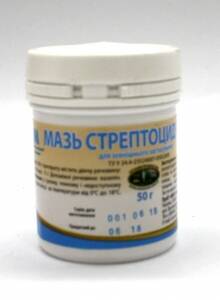 Описание Мазь белого или желтоватого цвета. Состав 100 г препарата содержит действующее вещество: стрептоцид – 5г Фармакологическое действие Стрептоцид препятствует образованию в клетках микроорганизмов так называемых факторов роста – фолиевой, дегидрофолиевой кислот, других соединений, которые содержат в своей молекуле пара-аминобензойную кислоту (ПАБК). Вследствие сходства структур ПАБК и стрептоцида, сульфаниламид как конкурентный антагонист кислоты включается в метаболическую цепь микроорганизмов и нарушает в ней процессы обмена, которые приводят к бактериостатическому эффекту. Стрептоцид – сульфаниламид короткого действия имеет бактериостатический эффект относительно стрептококков, менингококков, пневмококков, гонококков, протея и других микроорганизмов (Streptococcus spp., Corinebacterium diphtheriae, Neisseria gonorrhoeae, Escherichia coli, Shigella spp., Proteus spp., Enterobacter spp., Klebsiella spp., Yersinia spp., Vibrio cholerae, Haemophilus influenzae, Bacteroides spp., Chlamydia spp.) Применение Лечение у крупного рогатого скота, лошадей, овец, коз, свиней, собак и котов инфицированных ран, ожогов, гнойно-воспалительных процессов, трещин кожи сосков, фурункулеза. Дозировка Наносить непосредственно на пораженную поверхность или на марлевую салфетку. Перевязки делают через 1-2 сутки. Противопоказания Повышенная чувствительность к сульфаниламидам. Предостережения Не применять животным с повышенной чувствительностью к сульфаниламидам. Форма выпуска Стеклянные банки, банки из стекломассы, или банки из полимерных материалов по 25 г, 50 г, 100 г, 200 г. Хранение Сухое, темное место при температуре от 0°С до 18°С. Срок хранения – 3 года
