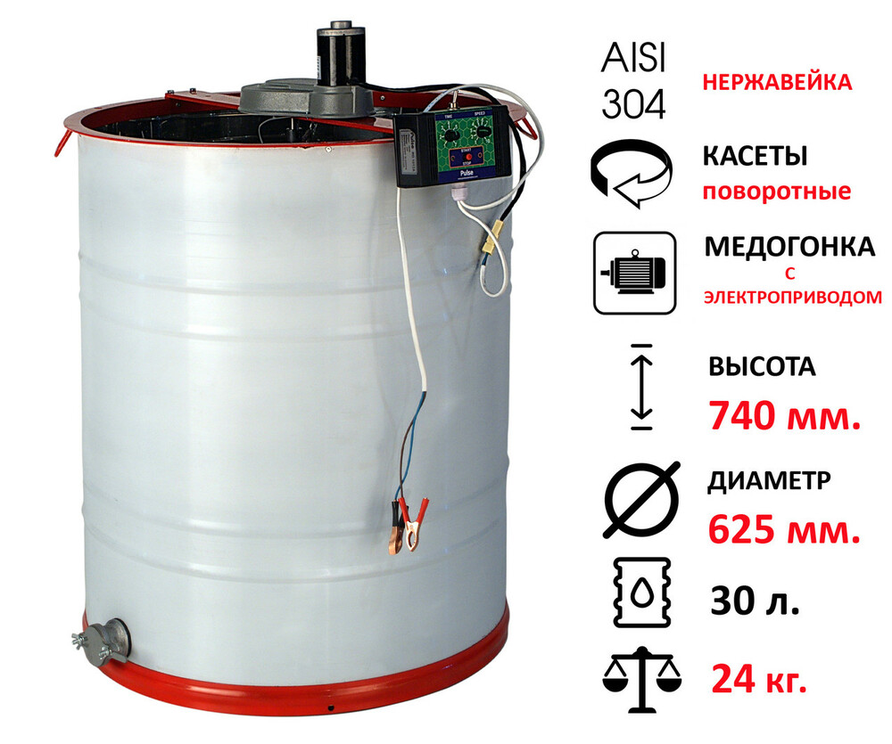 Медогонка 4-х рамкова з поворотними касетами, виготовлена з нержавіючої сталі, комплектується електричним-ременним приводом "Pulse" мод.1